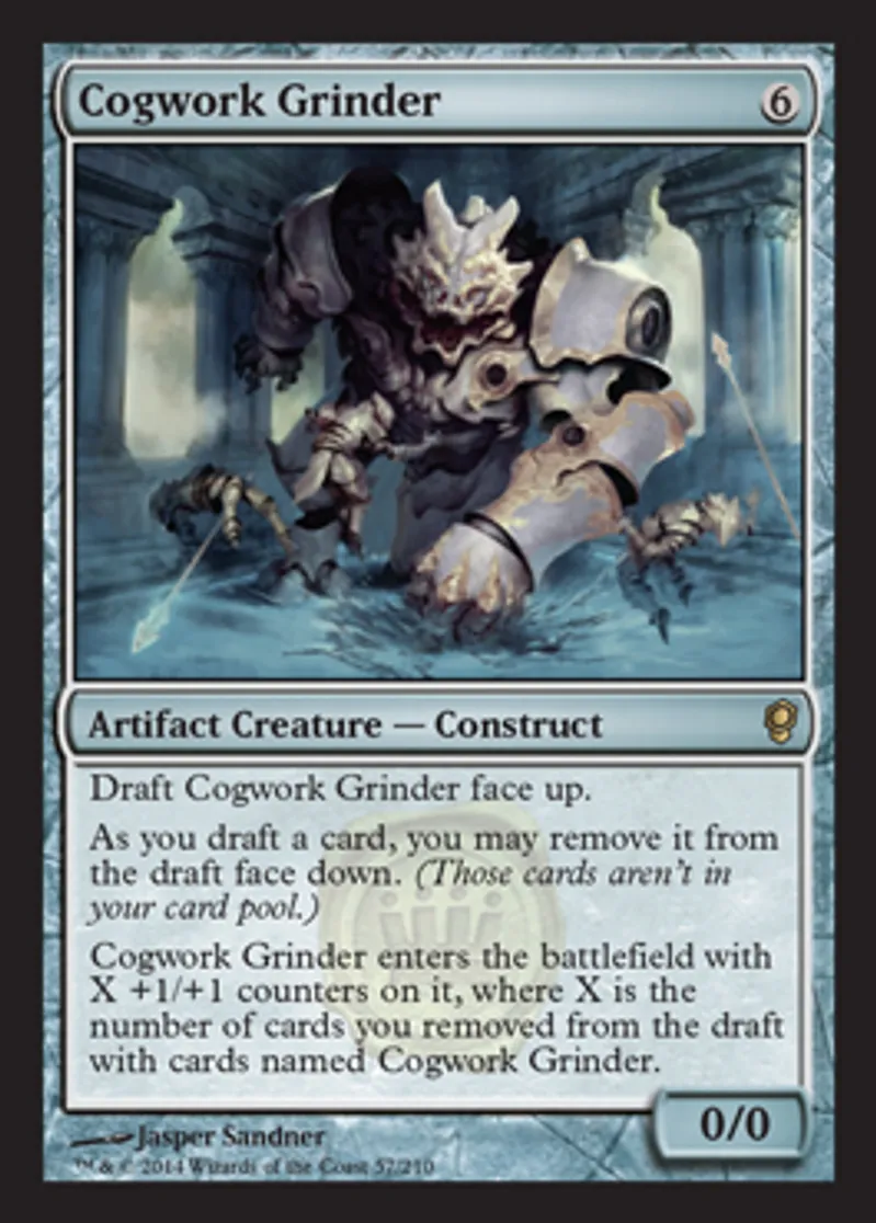 | Oracle Text | Draft Cogwork Grinder face up. As you draft a card, you may remove it from the draft face down. (Those cards aren't in your card pool.) Cogwork Grinder enters the battlefield with X +1/+1 counters on it, where X is the number of cards you removed from the draft with cards named Cogwork Grinder. | ||