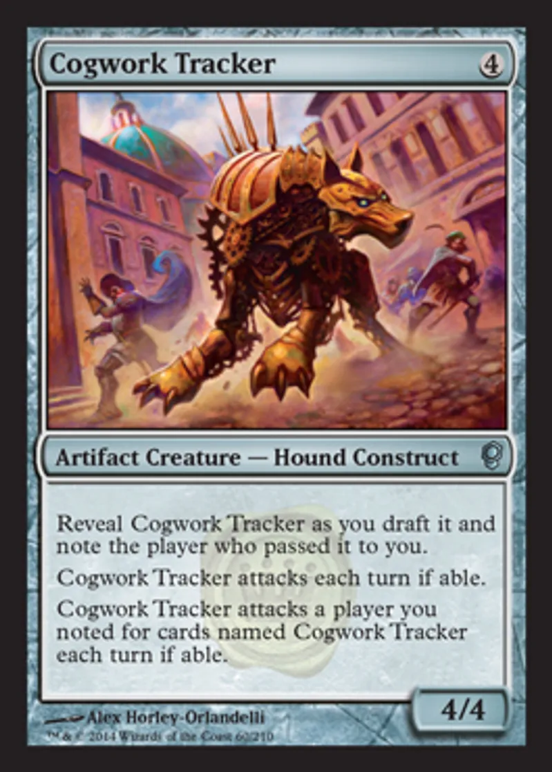 | Oracle Text | Reveal Cogwork Tracker as you draft it and note the player who passed it to you. Cogwork Tracker attacks each turn if able. Cogwork Tracker attacks a player you noted for cards named Cogwork Tracker each turn if able. | ||