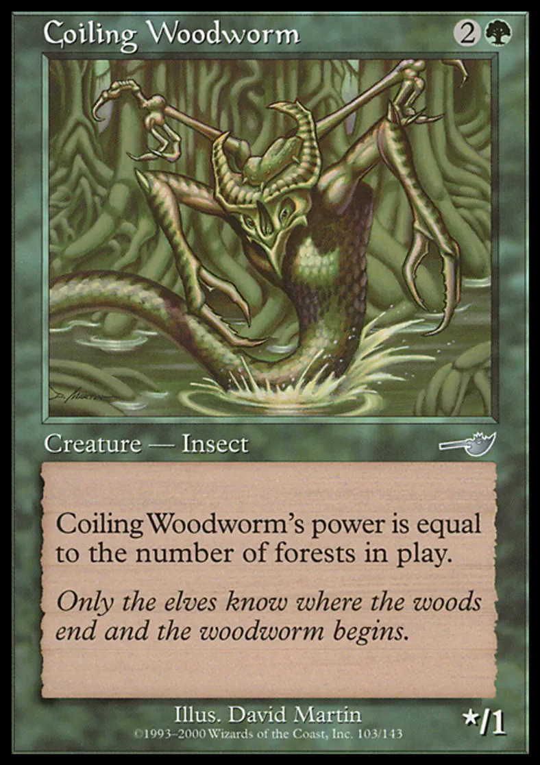 | Oracle Text | Coiling Woodworm's power is equal to the number of Forests on the battlefield. | ||