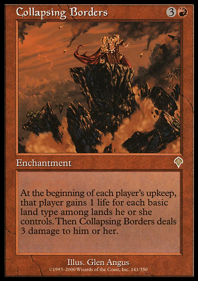 | Oracle Text | Domain — At the beginning of each player's upkeep, that player gains 1 life for each basic land type among lands he or she controls. Then Collapsing Borders deals 3 damage to him or her. | ||