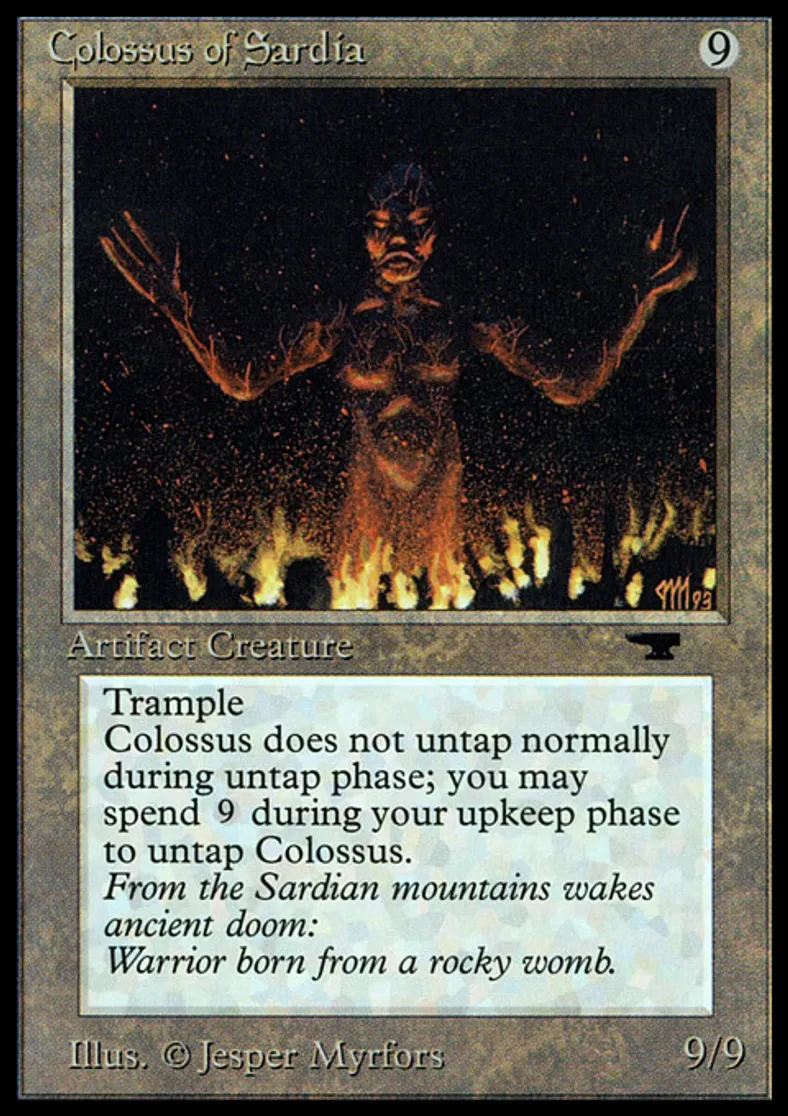 | Oracle Text | Trample (If this creature would assign enough damage to its blockers to destroy them, you may have it assign the rest of its damage to defending player or planeswalker.) Colossus of Sardia doesn't untap during your untap step. {{9}}: Untap Colossus of Sardia. Activate this ability only during your upkeep. | ||