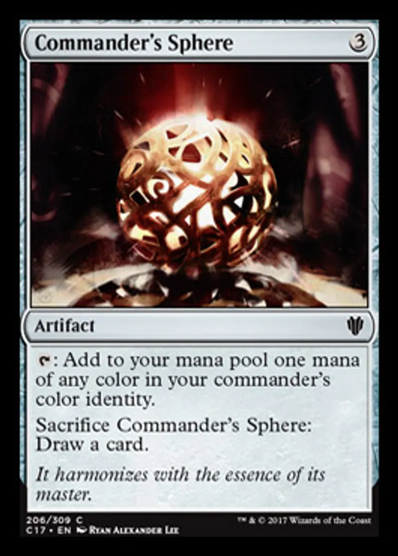 | Oracle Text | {{t}}: Add to your mana pool one mana of any color in your commander's color identity. Sacrifice Commander's Sphere: Draw a card. | ||