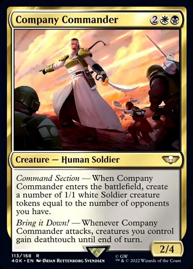 | Oracle Text | Command Section — When Company Commander enters the battlefield, create a number of 1/1 white Soldier creature tokens equal to the number of opponents you have.
