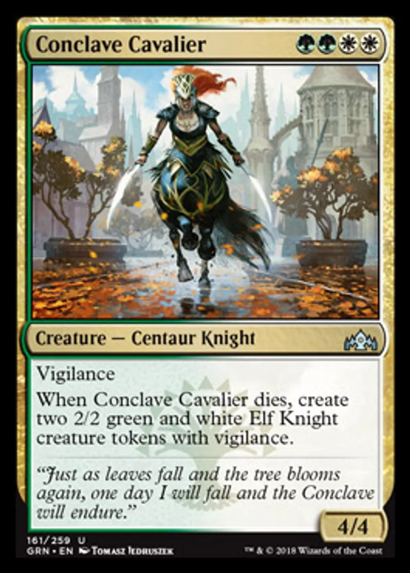 | Oracle Text | Vigilance When Conclave Cavalier dies, create two 2/2 green and white Elf Knight creature tokens with vigilance. | ||