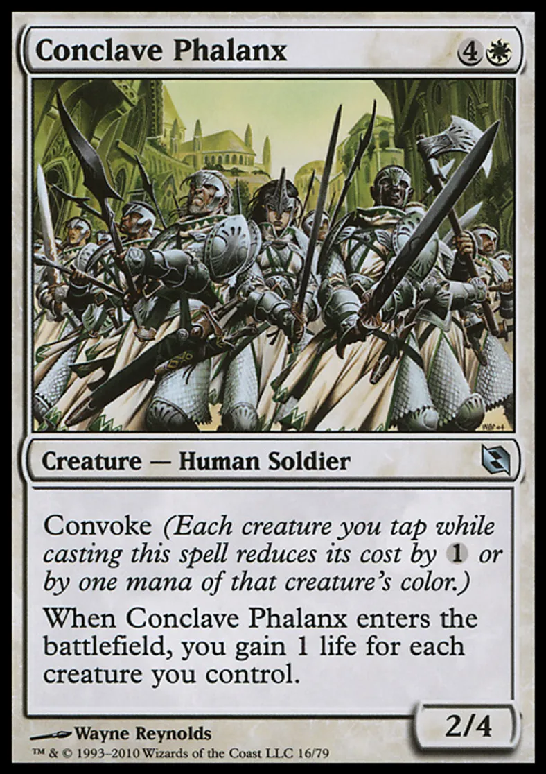 | Oracle Text | Convoke (Each creature you tap while casting this spell reduces its cost by {{1}} or by one mana of that creature's color.) When Conclave Phalanx enters the battlefield, you gain 1 life for each creature you control. | ||