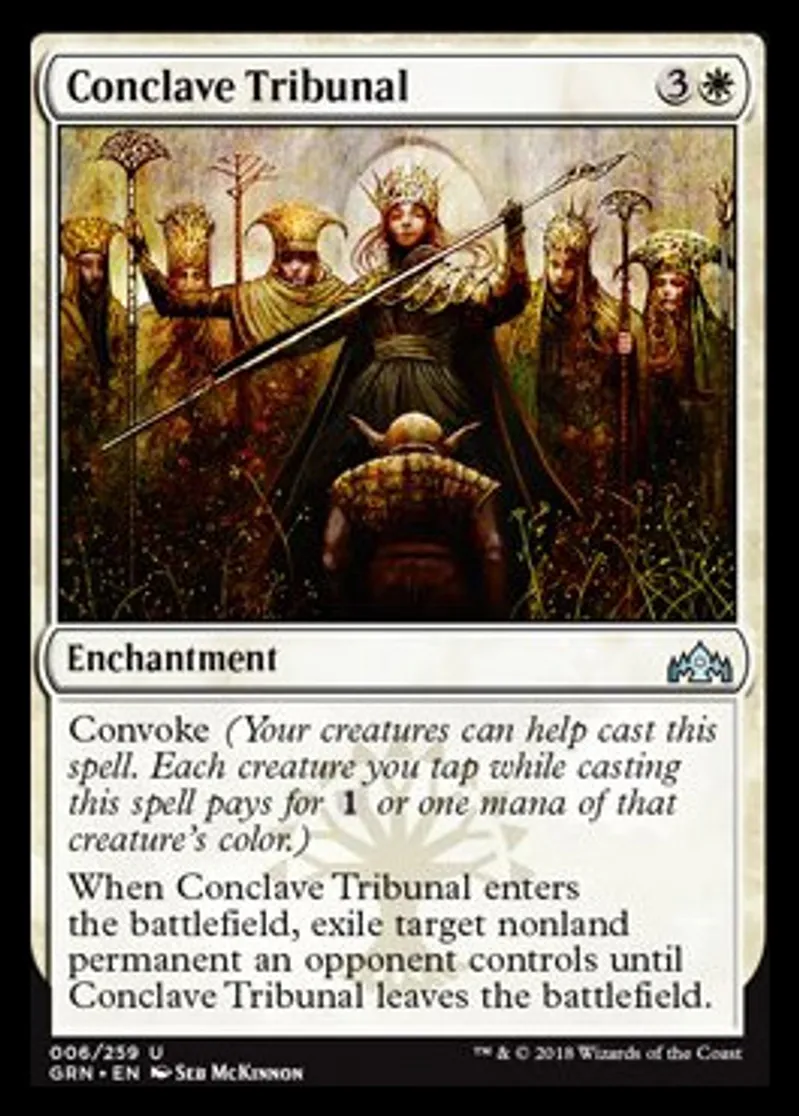 | Oracle Text | Convoke (Your creatures can help cast this spell. Each creature you tap while casting this spell pays for {{1}} or one mana of that creature's color.) When Conclave Tribunal enters the battlefield, exile target nonland permanent an opponent controls until Conclave Tribunal leaves the battlefield. | ||