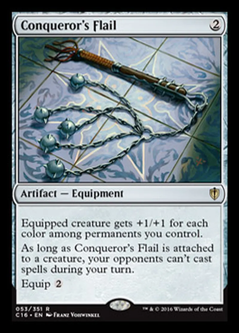 | Oracle Text | Equipped creature gets +1/+1 for each color among permanents you control. As long as Conqueror's Flail is attached to a creature, your opponents can't cast spells during your turn. Equip {{2}} | ||