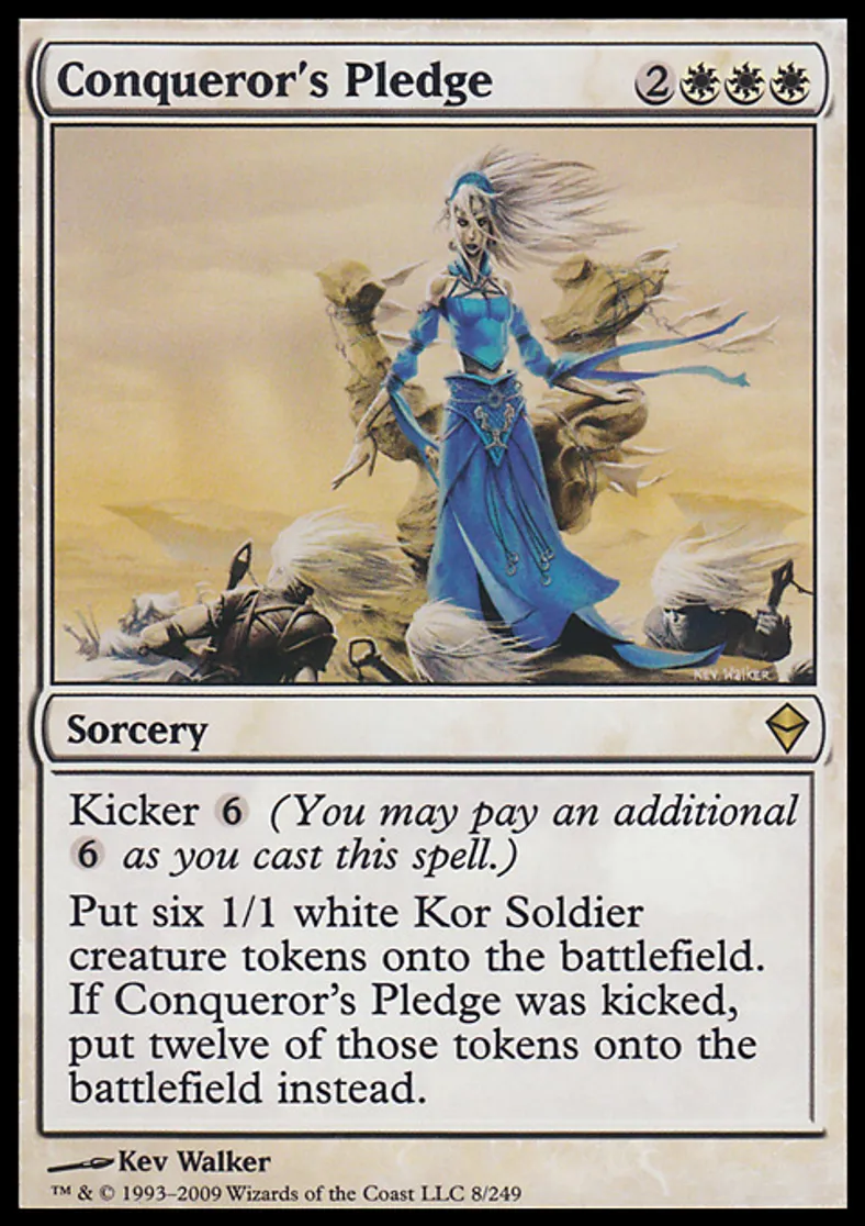 | Oracle Text | Kicker {{6}} (You may pay an additional {{6}} as you cast this spell.) Put six 1/1 white Kor Soldier creature tokens onto the battlefield. If Conqueror's Pledge was kicked, put twelve of those tokens onto the battlefield instead. | ||