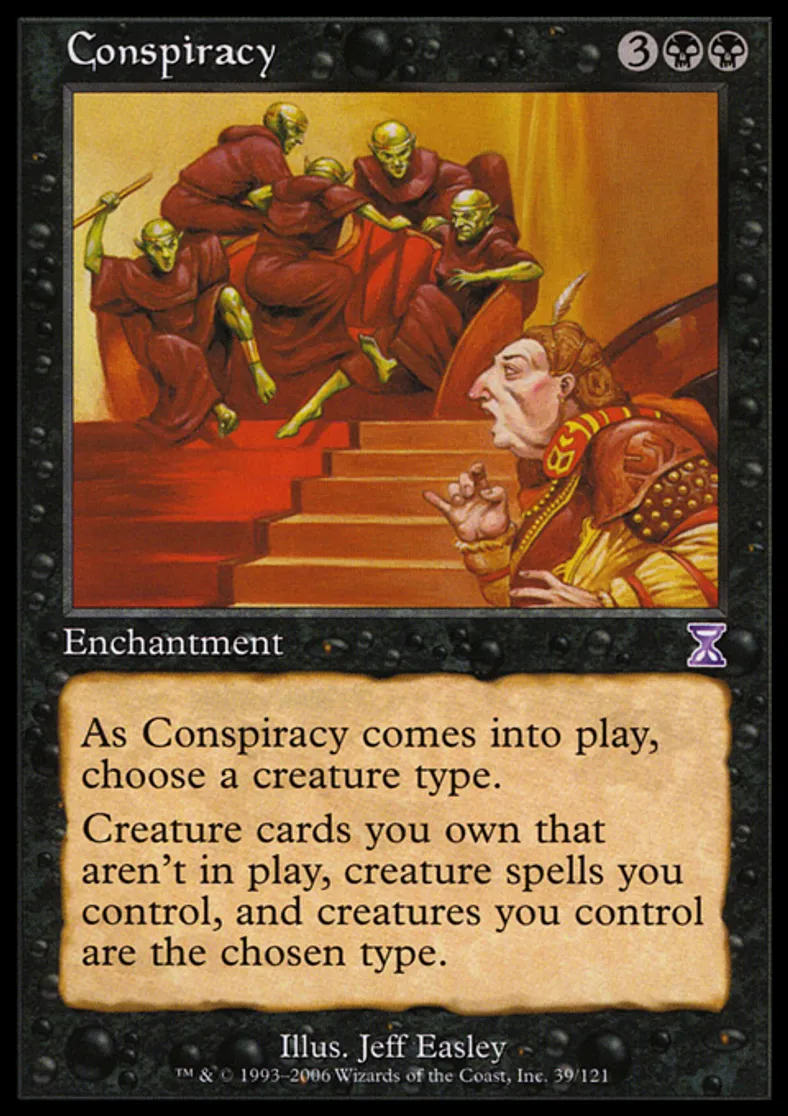 | Oracle Text | As Conspiracy enters the battlefield, choose a creature type. Creature cards you own that aren't on the battlefield, creature spells you control, and creatures you control are the chosen type. | ||