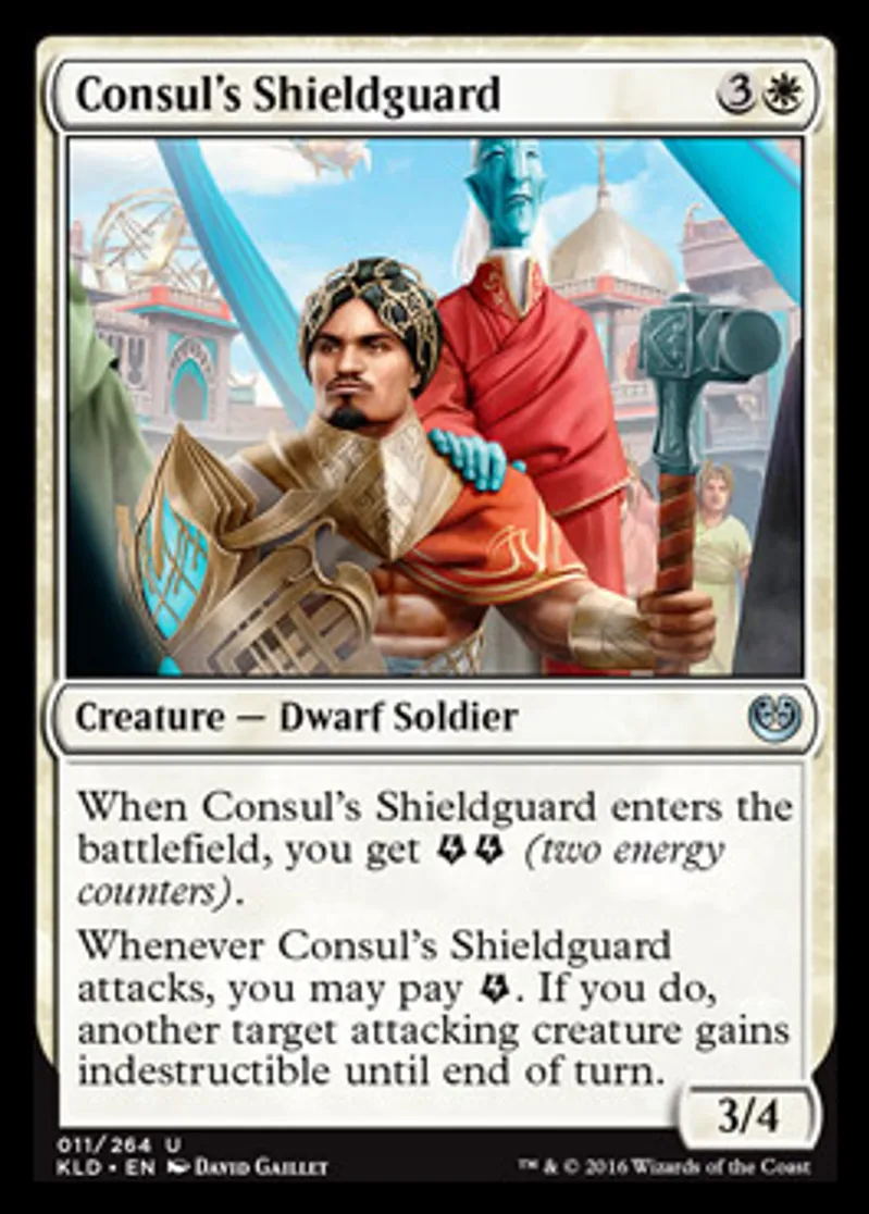 | Oracle Text | When Consul's Shieldguard enters the battlefield, you get {{Energy}}{{Energy}} (two energy counters). Whenever Consul's Shieldguard attacks, you may pay {{Energy}}. If you do, another target attacking creature gains indestructible until end of turn. | ||