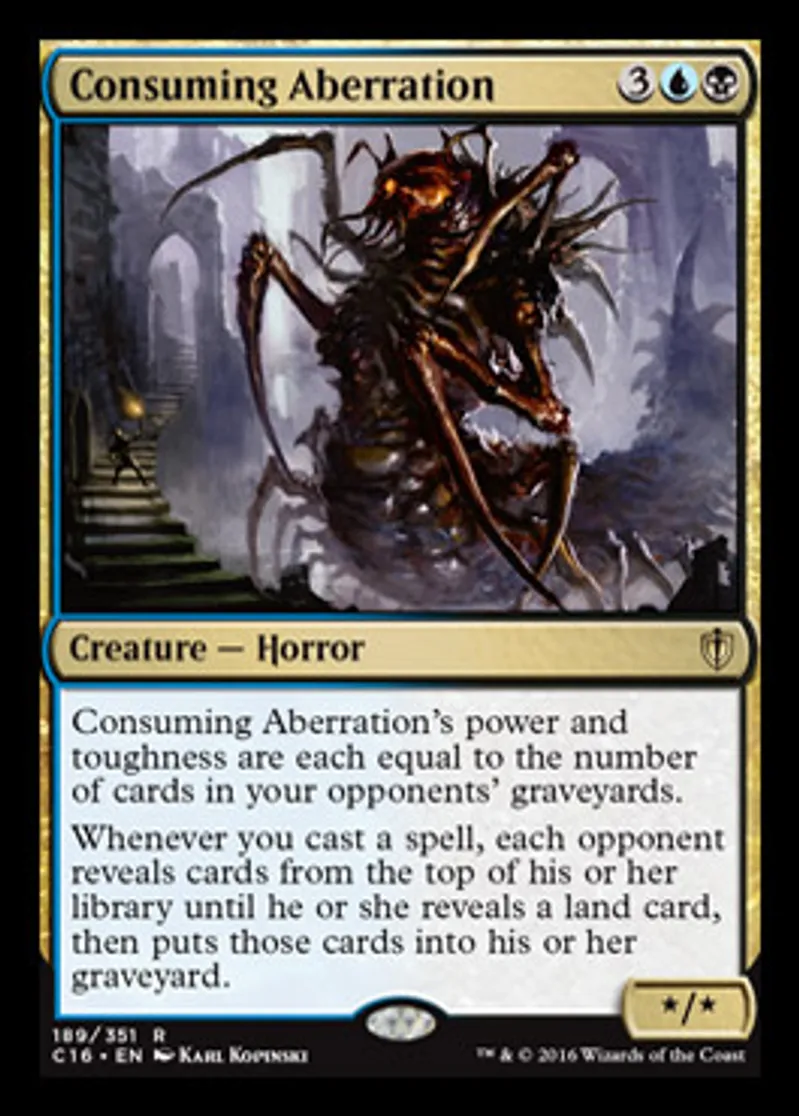 | Oracle Text | Consuming Aberration's power and toughness are each equal to the number of cards in your opponents' graveyards. Whenever you cast a spell, each opponent reveals cards from the top of his or her library until he or she reveals a land card, then puts those cards into his or her graveyard. | ||