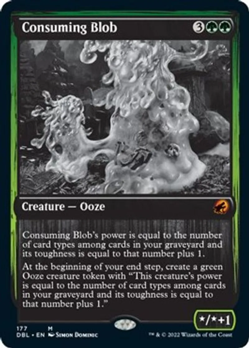 | Oracle Text | Consuming Blob's power is equal to the number of card types among cards in your graveyard and its toughness is equal to that number plus 1.
