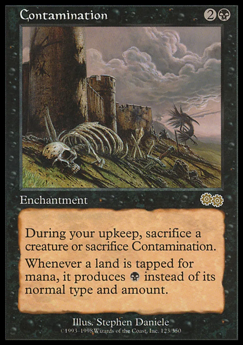 | Oracle Text | At the beginning of your upkeep, sacrifice Contamination unless you sacrifice a creature. If a land is tapped for mana, it produces {{b}} instead of any other type and amount. | ||