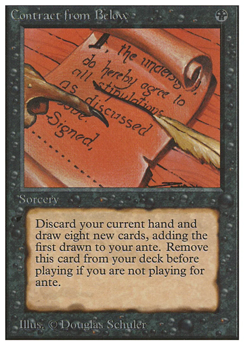 | Oracle Text | Remove Contract from Below from your deck before playing if you're not playing for ante. Discard your hand, add the top card of your library to the ante, then draw seven cards. | ||