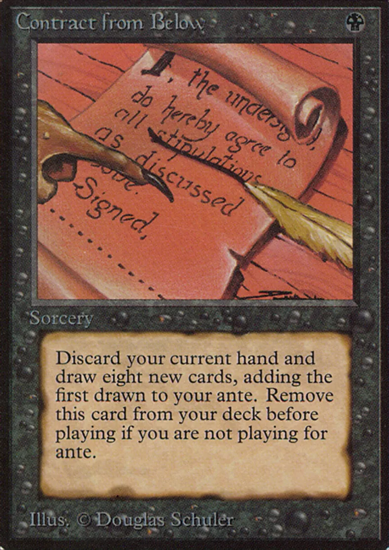 | Oracle Text | Remove Contract from Below from your deck before playing if you're not playing for ante. Discard your hand, add the top card of your library to the ante, then draw seven cards. | ||
