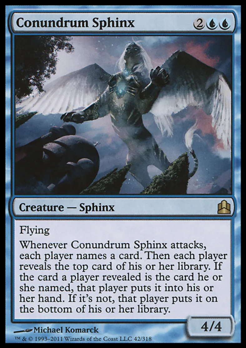 | Oracle Text | Flying Whenever Conundrum Sphinx attacks, each player names a card. Then each player reveals the top card of his or her library. If the card a player revealed is the card he or she named, that player puts it into his or her hand. If it's not, that player puts it on the bottom of his or her library. | ||