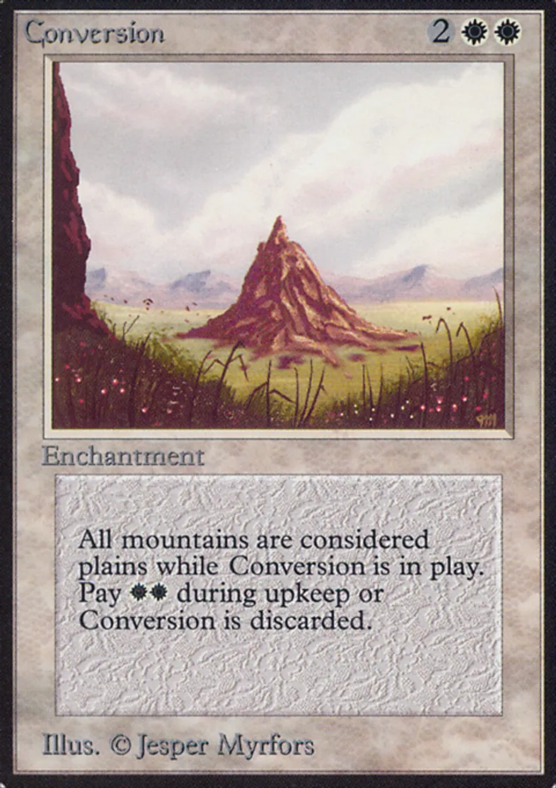 | Oracle Text | At the beginning of your upkeep, sacrifice Conversion unless you pay {{w}}{{w}}. All Mountains are Plains. | ||