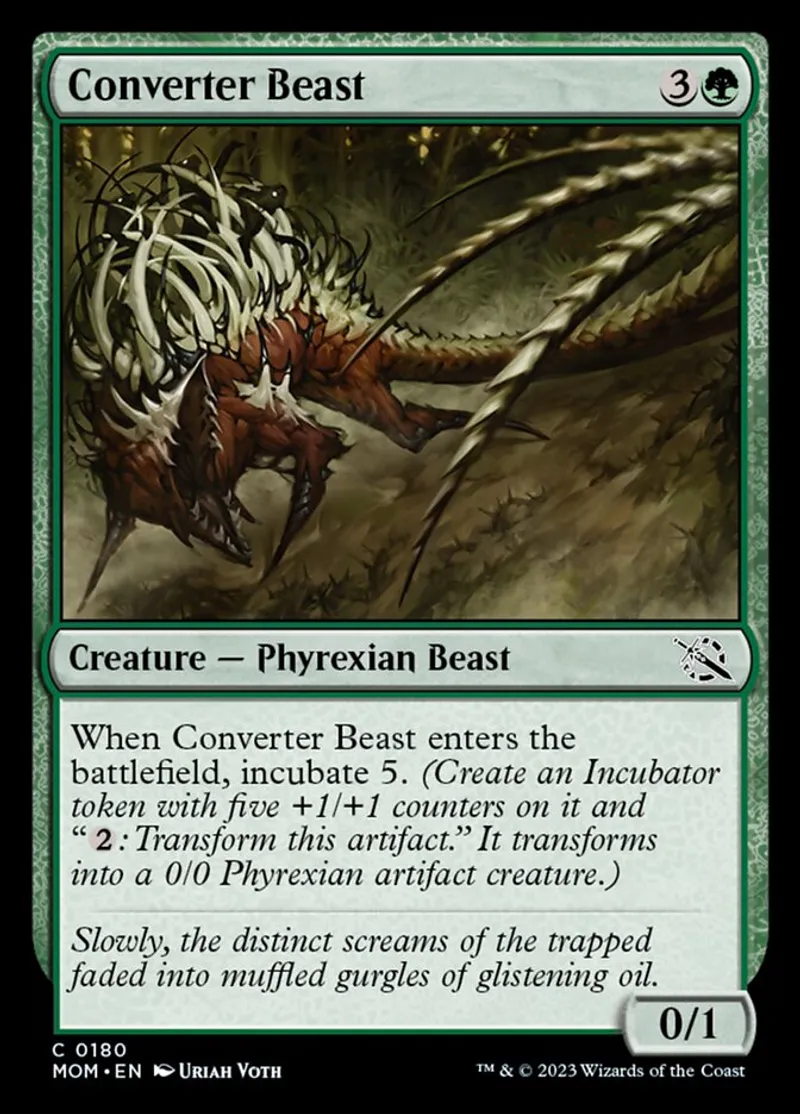 | Oracle Text | When Converter Beast enters the battlefield, incubate 5. (Create an Incubator token with five +1/+1 counters on it and "{2}: Transform this artifact." It transforms into a 0/0 Phyrexian artifact creature.) | ||