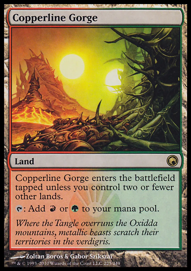 | Oracle Text | Copperline Gorge enters the battlefield tapped unless you control two or fewer other lands. {{t}}: Add {{r}} or {{g}} to your mana pool. | ||