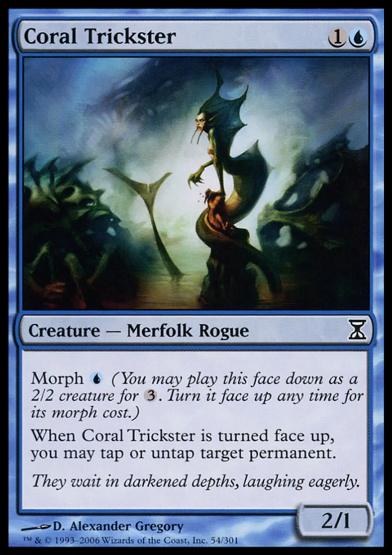 | Oracle Text | Morph {{u}} (You may cast this face down as a 2/2 creature for {{3}}. Turn it face up any time for its morph cost.) When Coral Trickster is turned face up, you may tap or untap target permanent. | ||
