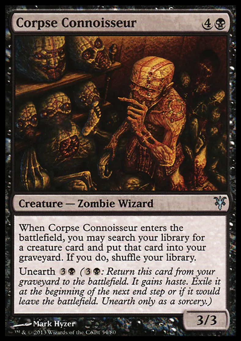 | Oracle Text | When Corpse Connoisseur enters the battlefield, you may search your library for a creature card and put that card into your graveyard. If you do, shuffle your library. Unearth {{3}}{{b}} ({{3}}{{b}}: Return this card from your graveyard to the battlefield. It gains haste. Exile it at the beginning of the next end step or if it would leave the battlefield. Unearth only as a sorcery.) | ||