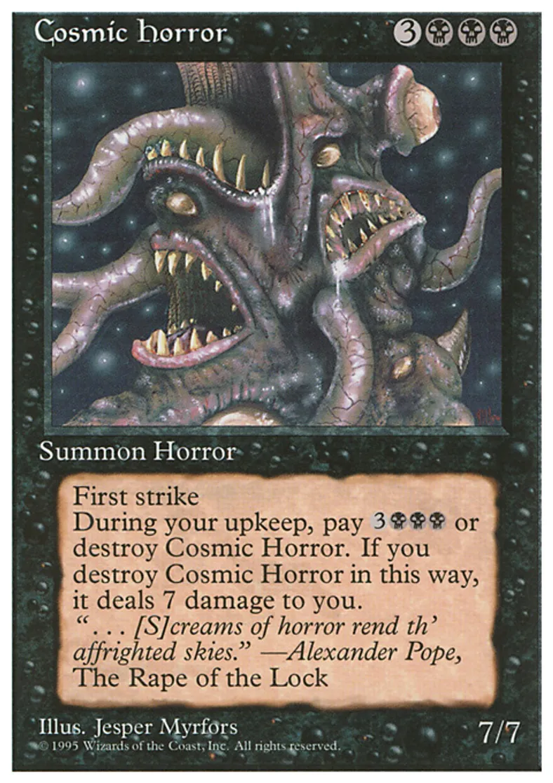 | Oracle Text | First strike At the beginning of your upkeep, destroy Cosmic Horror unless you pay {{3}}{{b}}{{b}}{{b}}. If Cosmic Horror is destroyed this way, it deals 7 damage to you. | ||