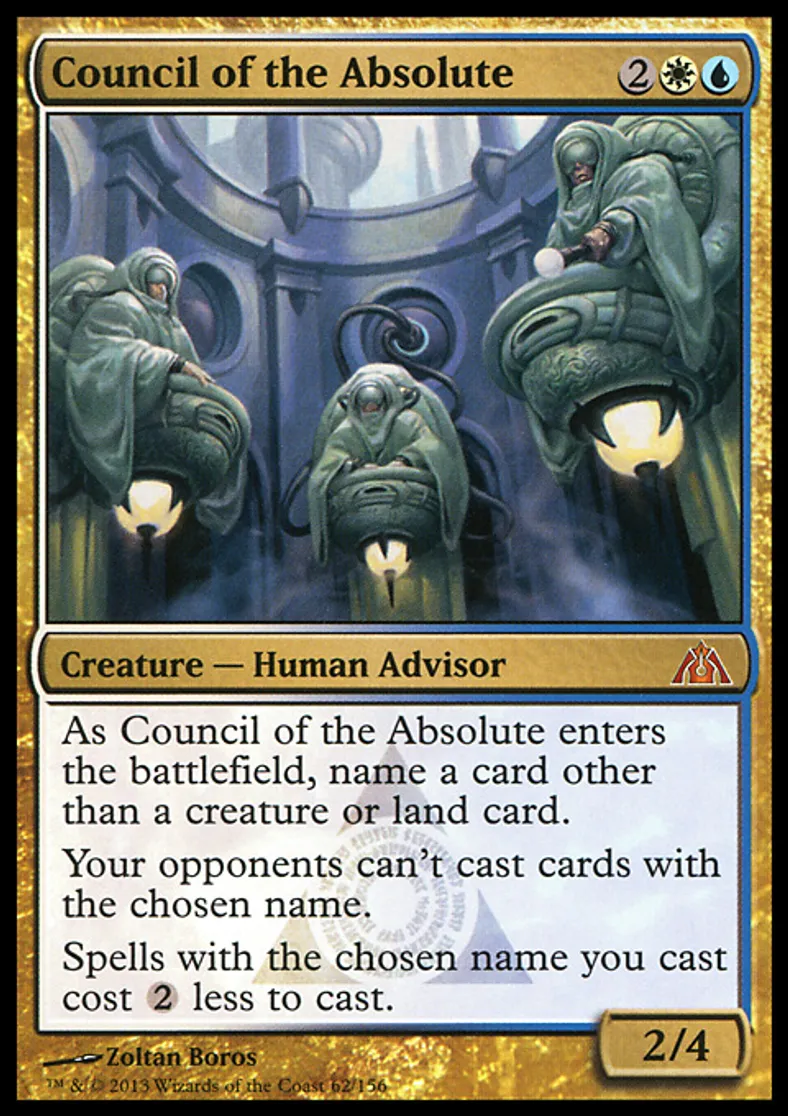 | Oracle Text | As Council of the Absolute enters the battlefield, name a card other than a creature or land card. Your opponents can't cast cards with the chosen name. Spells with the chosen name you cast cost {{2}} less to cast. | ||