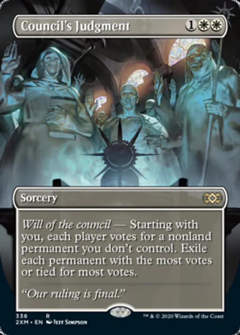 | Oracle Text | Will of the council — Starting with you, each player votes for a nonland permanent you don’t control. Exile each permanent with the most votes or tied for most votes. | ||