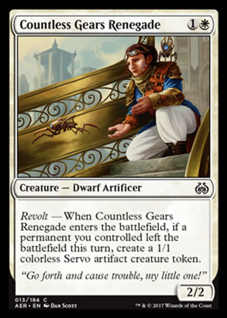 | Oracle Text | Revolt — When Countless Gears Renegade enters the battlefield, if a permanent you controlled left the battlefield this turn, create a 1/1 colorless Servo artifact creature token. | ||
