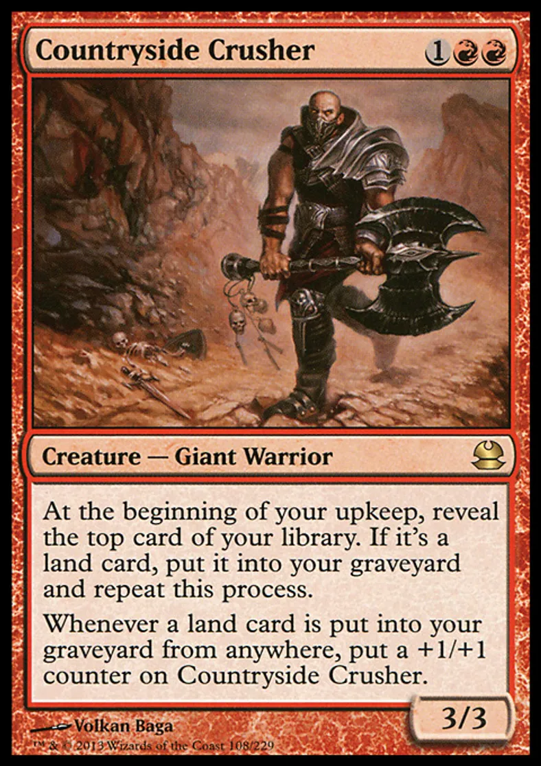| Oracle Text | At the beginning of your upkeep, reveal the top card of your library. If it's a land card, put it into your graveyard and repeat this process. Whenever a land card is put into your graveyard from anywhere, put a +1/+1 counter on Countryside Crusher. | ||