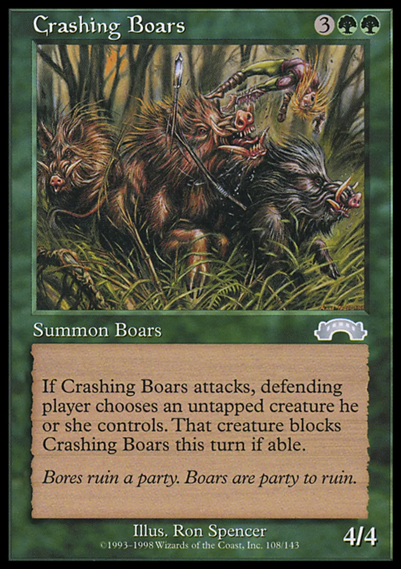 | Oracle Text | Whenever Crashing Boars attacks, defending player chooses an untapped creature he or she controls. That creature blocks Crashing Boars this turn if able. | ||