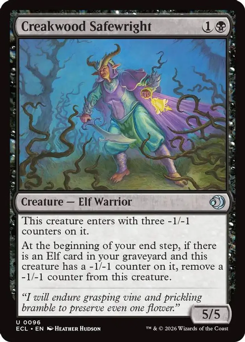 Magic: the Gathering (mtg) Uncommon creature — elf warrior Creakwood Safewright from Lorwyn Eclipsed (ECL) last updated 2026-01-11 16:21:35