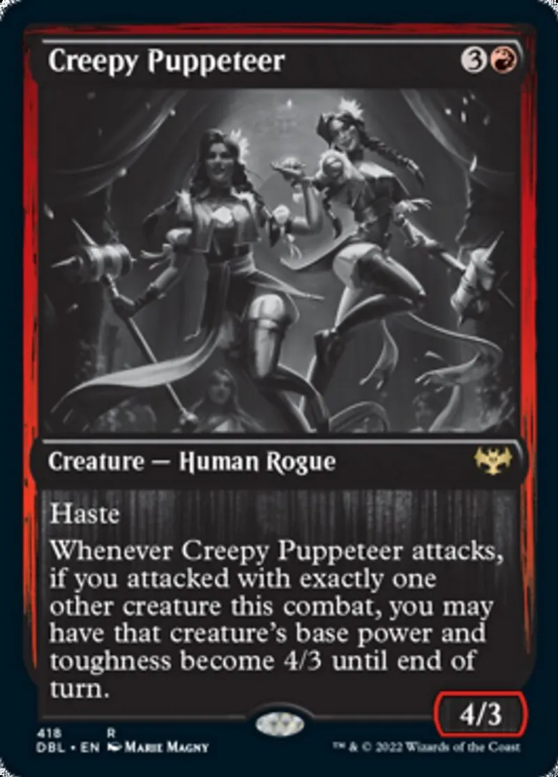 Whenever Creepy Puppeteer attacks, if you attacked with exactly one other creature this combat, you may have that creature's base power and toughness become 4/3 until end of turn. | ||