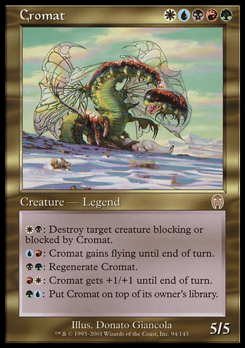| Oracle Text | {{w}}{{b}}: Destroy target creature blocking or blocked by Cromat. {{u}}{{r}}: Cromat gains flying until end of turn. {{b}}{{g}}: Regenerate Cromat. {{r}}{{w}}: Cromat gets +1/+1 until end of turn. {{g}}{{u}}: Put Cromat on top of its owner's library. | ||