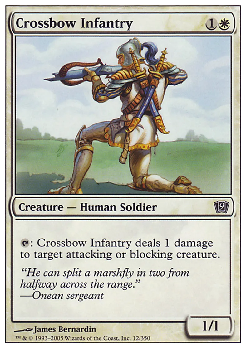 | Oracle Text | {{t}}: Crossbow Infantry deals 1 damage to target attacking or blocking creature. | ||