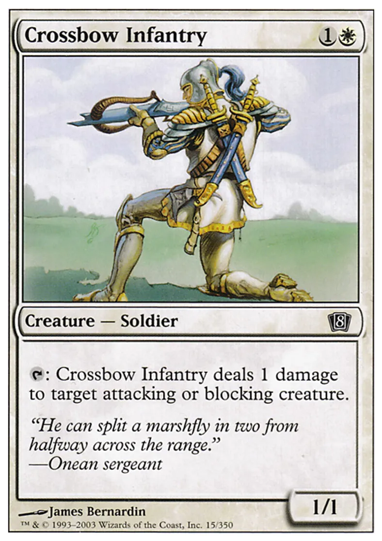 | Oracle Text | {{t}}: Crossbow Infantry deals 1 damage to target attacking or blocking creature. | ||