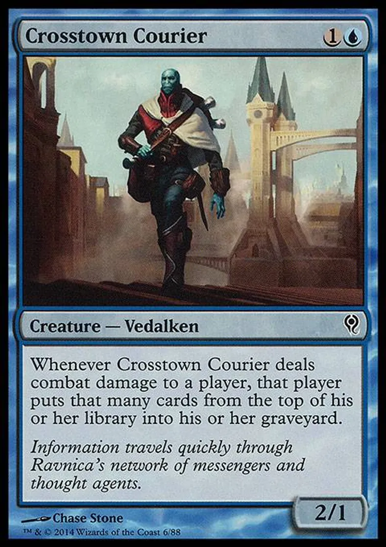 | Oracle Text | Whenever Crosstown Courier deals combat damage to a player, that player puts that many cards from the top of his or her library into his or her graveyard. | ||