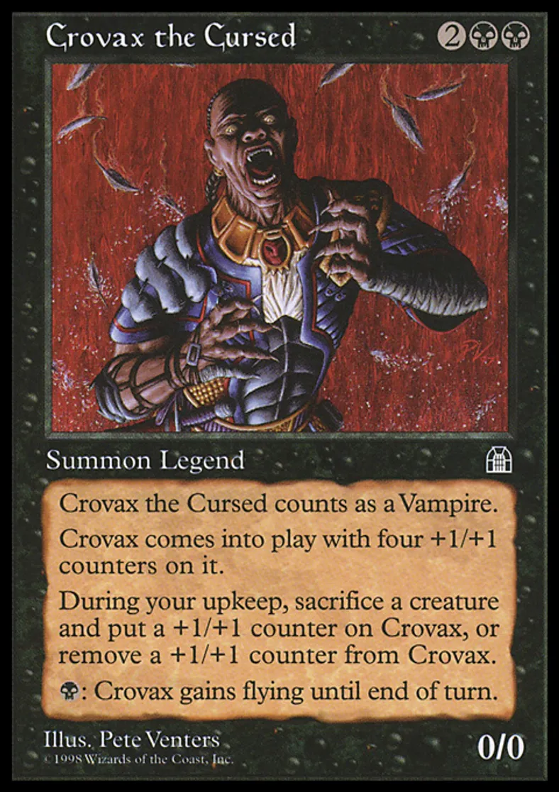 | Oracle Text | Crovax the Cursed enters the battlefield with four +1/+1 counters on it. At the beginning of your upkeep, you may sacrifice a creature. If you do, put a +1/+1 counter on Crovax. If you don't, remove a +1/+1 counter from Crovax. {{b}}: Crovax gains flying until end of turn. | ||