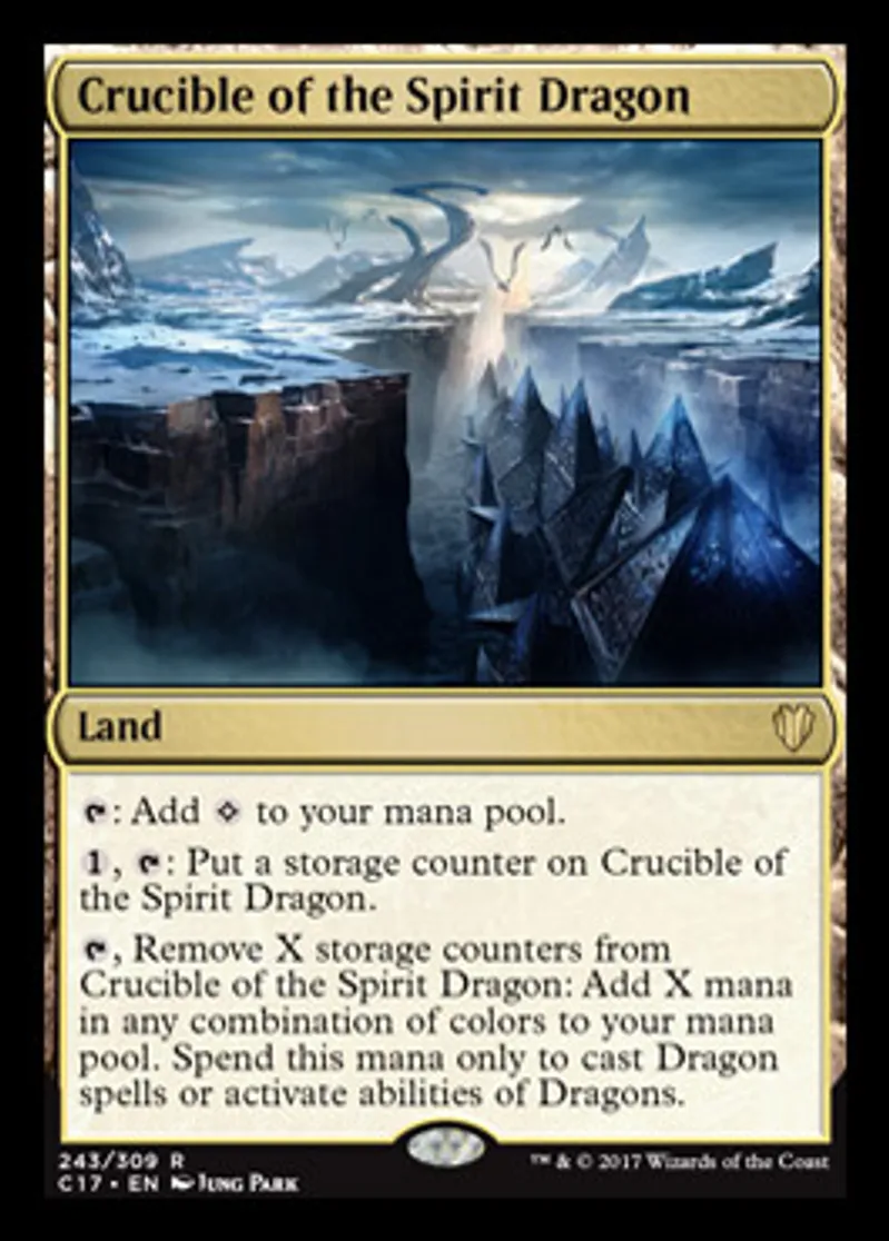 | Oracle Text | {{t}}: Add {{Colorless}} to your mana pool. {{1}}, {{t}}: Put a storage counter on Crucible of the Spirit Dragon. {{t}}, Remove X storage counters from Crucible of the Spirit Dragon: Add X mana in any combination of colors to your mana pool. Spend this mana only to cast Dragon spells or activate abilities of Dragons. | ||