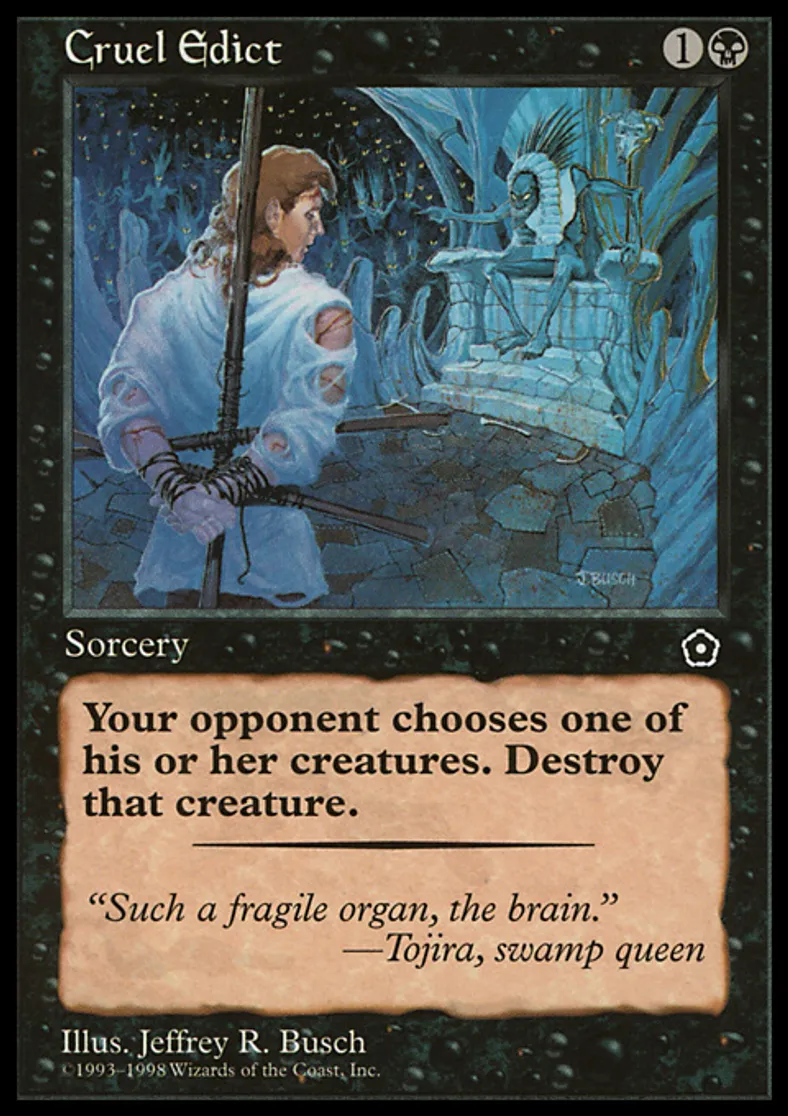 Magic: the Gathering (mtg) Common Sorcery Cruel Edict from Portal Second Age (P02) last updated 2026-02-21 17:32:02