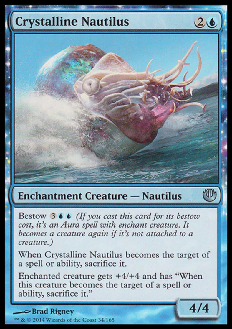 | Oracle Text | Bestow {{3}}{{u}}{{u}} (If you cast this card for its bestow cost, it's an Aura spell with enchant creature. It becomes a creature again if it's not attached to a creature.) When Crystalline Nautilus becomes the target of a spell or ability, sacrifice it. Enchanted creature gets +4/+4 and has "When this creature becomes the target of a spell or ability, sacrifice it." | ||