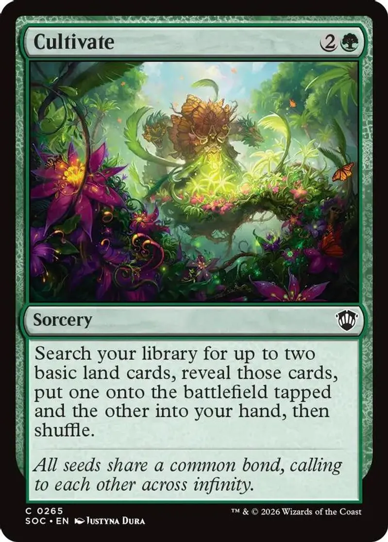 Magic: the Gathering (mtg) Common sorcery Cultivate from Commander: Secrets of Strixhaven (SOC) last updated 2026-04-17 00:24:10