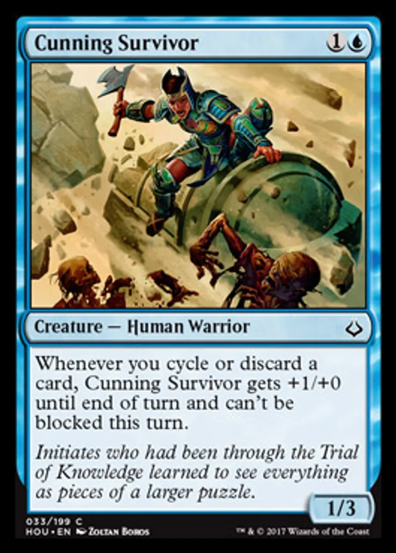| Oracle Text | Whenever you cycle or discard a card, Cunning Survivor gets +1/+0 until end of turn and can't be blocked this turn. | ||
