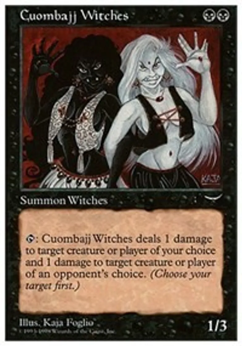 | Oracle Text | {{t}}: Cuombajj Witches deals 1 damage to target creature or player and 1 damage to target creature or player of an opponent's choice. (Choose your target first.) | ||