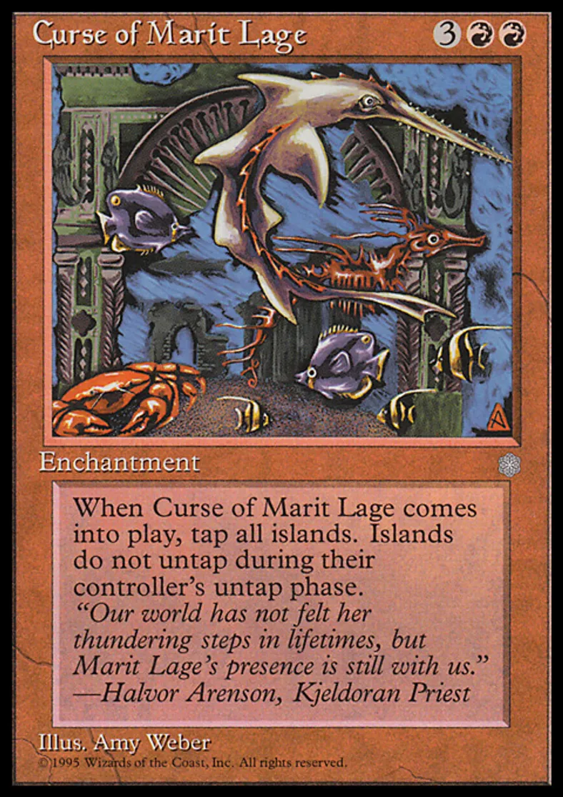 | Oracle Text | When Curse of Marit Lage enters the battlefield, tap all Islands. Islands don't untap during their controllers' untap steps. | ||