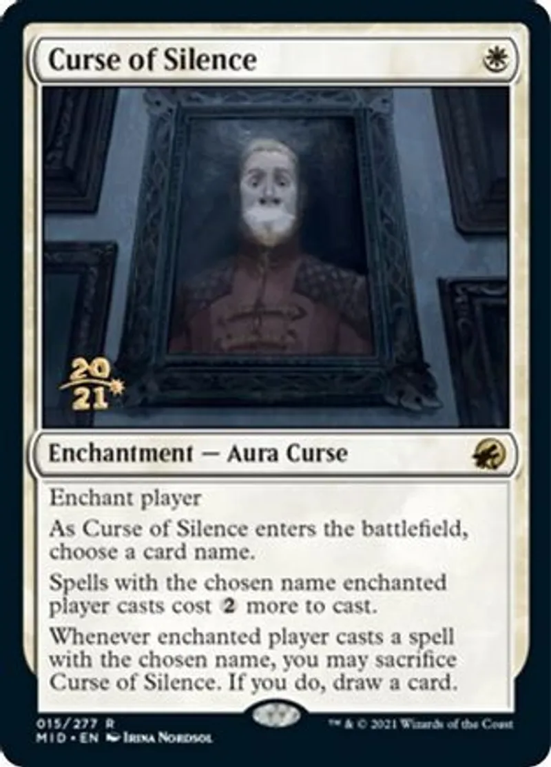 Whenever enchanted player casts a spell with the chosen name, you may sacrifice Curse of Silence. If you do, draw a card. | ||
