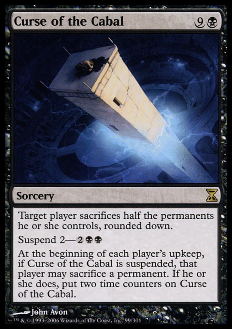 | Oracle Text | Target player sacrifices half the permanents he or she controls, rounded down. Suspend 2—{{2}}{{b}}{{b}} (Rather than cast this card from your hand, you may pay {{2}}{{b}}{{b}} and exile it with two time counters on it. At the beginning of your upkeep, remove a time counter. When the last is removed, cast it without paying its mana cost.) At the beginning of each player's upkeep, if Curse of the Cabal is suspended, that player may sacrifice a permanent. If he or she does, put two time counters on Curse of the Cabal. | ||