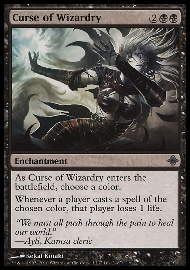 | Oracle Text | As Curse of Wizardry enters the battlefield, choose a color. Whenever a player casts a spell of the chosen color, that player loses 1 life. | ||
