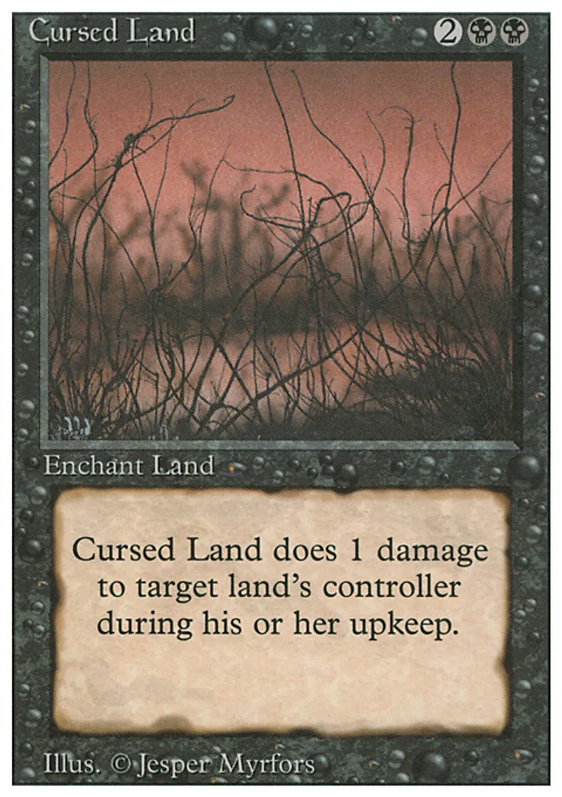 | Oracle Text | Enchant land At the beginning of the upkeep of enchanted land's controller, Cursed Land deals 1 damage to that player. | ||