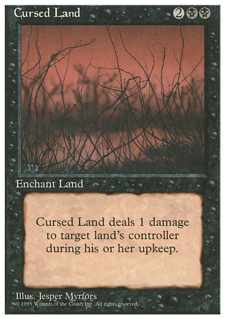 | Oracle Text | Enchant land At the beginning of the upkeep of enchanted land's controller, Cursed Land deals 1 damage to that player. | ||